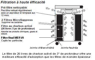 • L'Airpura T600 et T700 sont équipés d'un filtre au charbon activé de 3" de profondeur. Plus de temps que l'air contaminé passe dans le filtre au charbon plus la filtration est efficace
