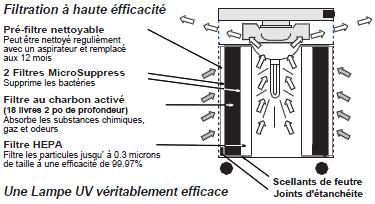 • Les UV600 et UV700 sont équipés d'une lampe UV de 20 watts stérilise les gênes et les virus pendant que les spores de moisissures et les bactéries sont captés par le filtre Hepa